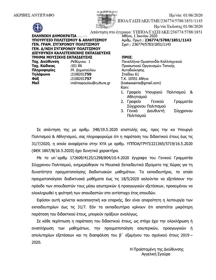 «Την έκδοση απόφασης – οδηγίας από ΥΠΠΟΑ, με την οποία θα επιτρέπεται η συνέχιση της εκπαιδευτικής διαδικασίας με κάθε εφικτό τρόπο και μέσο (εξ αποστάσεως παροχής εργασίας με τη χρήση ηλεκτρονικών μέσων, π.χ: Skype, Zoom, Viber κ.ά)».
